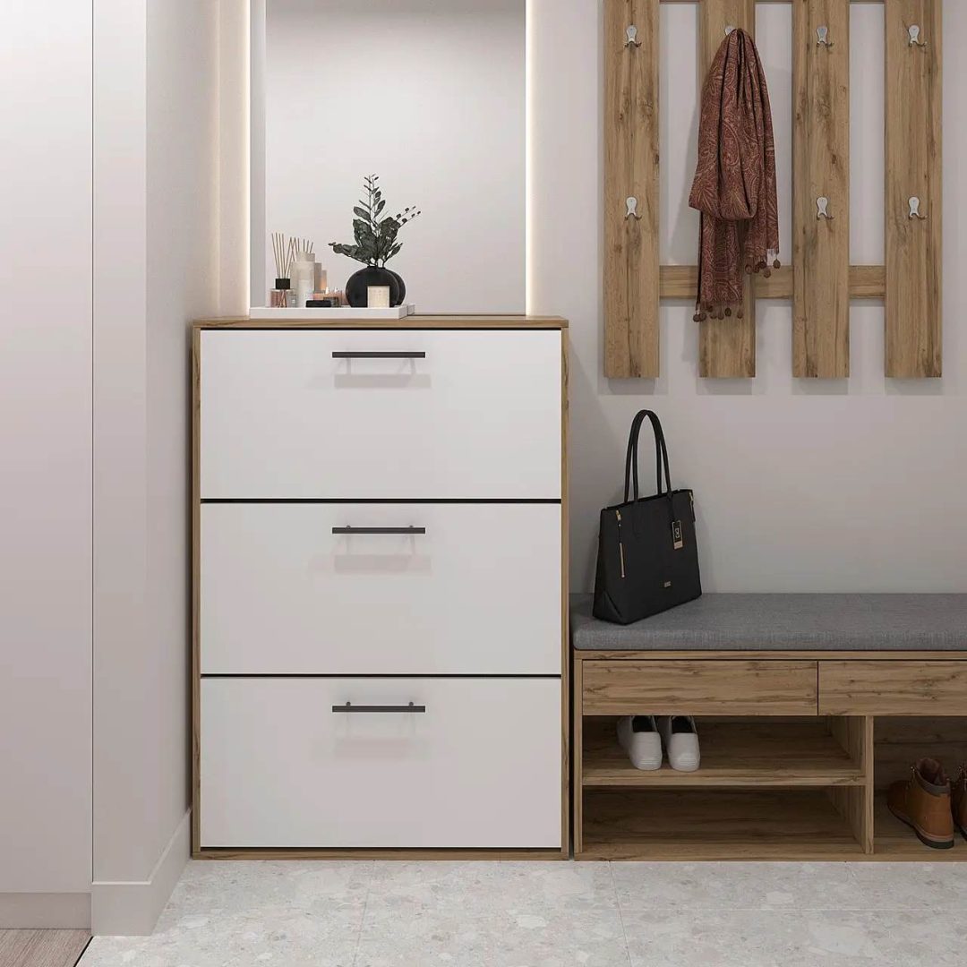 Сучасна тумба для взуття з трьома місткими відділеннями – стильне та практичне рішення для передпокою. Компактна конструкція дозволяє ефективно використовувати простір, забезпечуючи зручне зберігання взуття. Ідеально підходить для сучасного інтер’єру, поєднуючи функціональність і стиль. Доповнити тумбу можна банкеткою/вішалкою/шафою/дзеркалом в одному стилі.