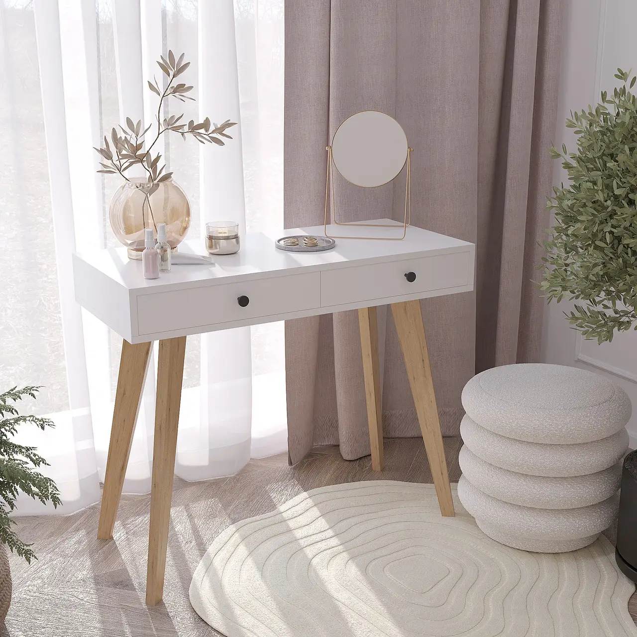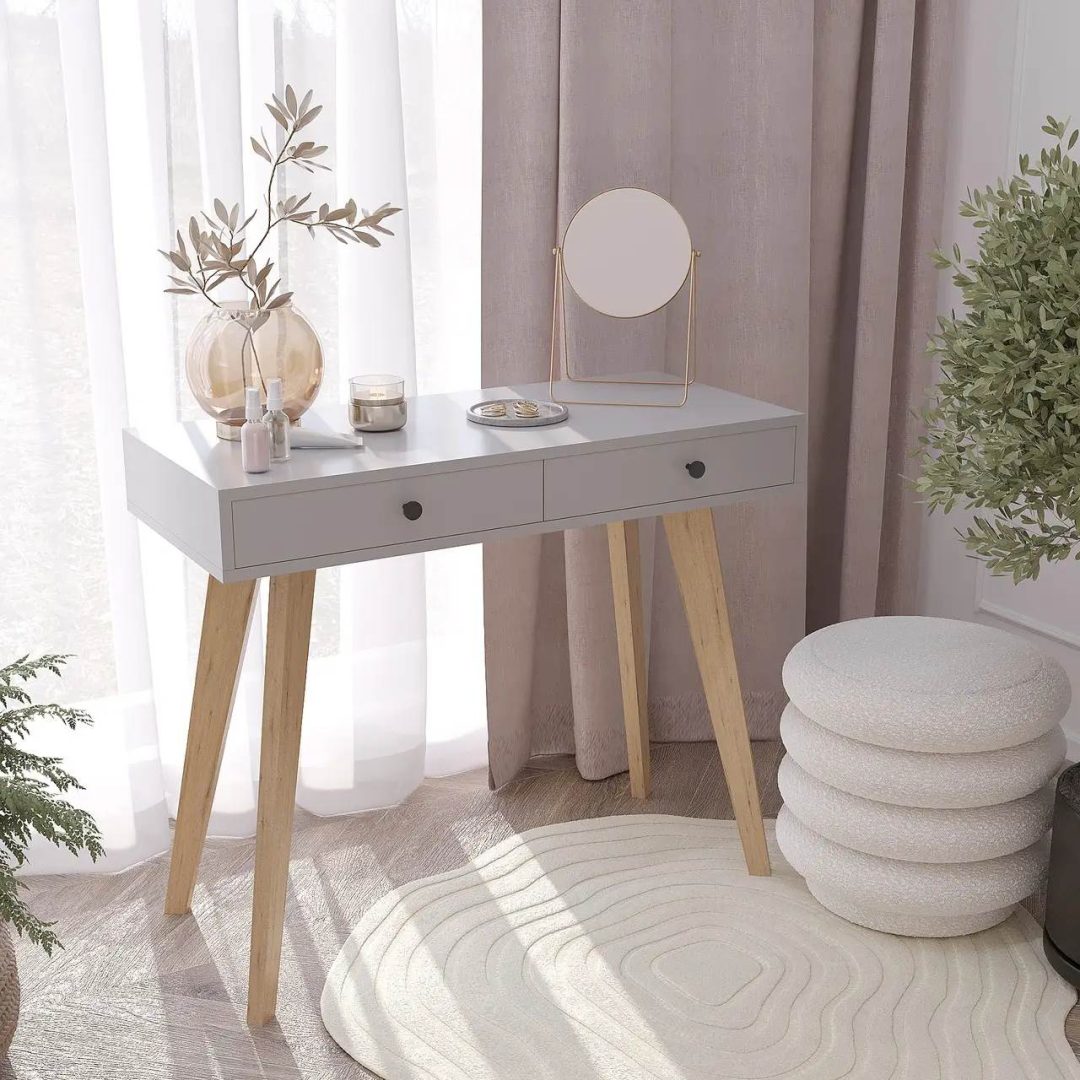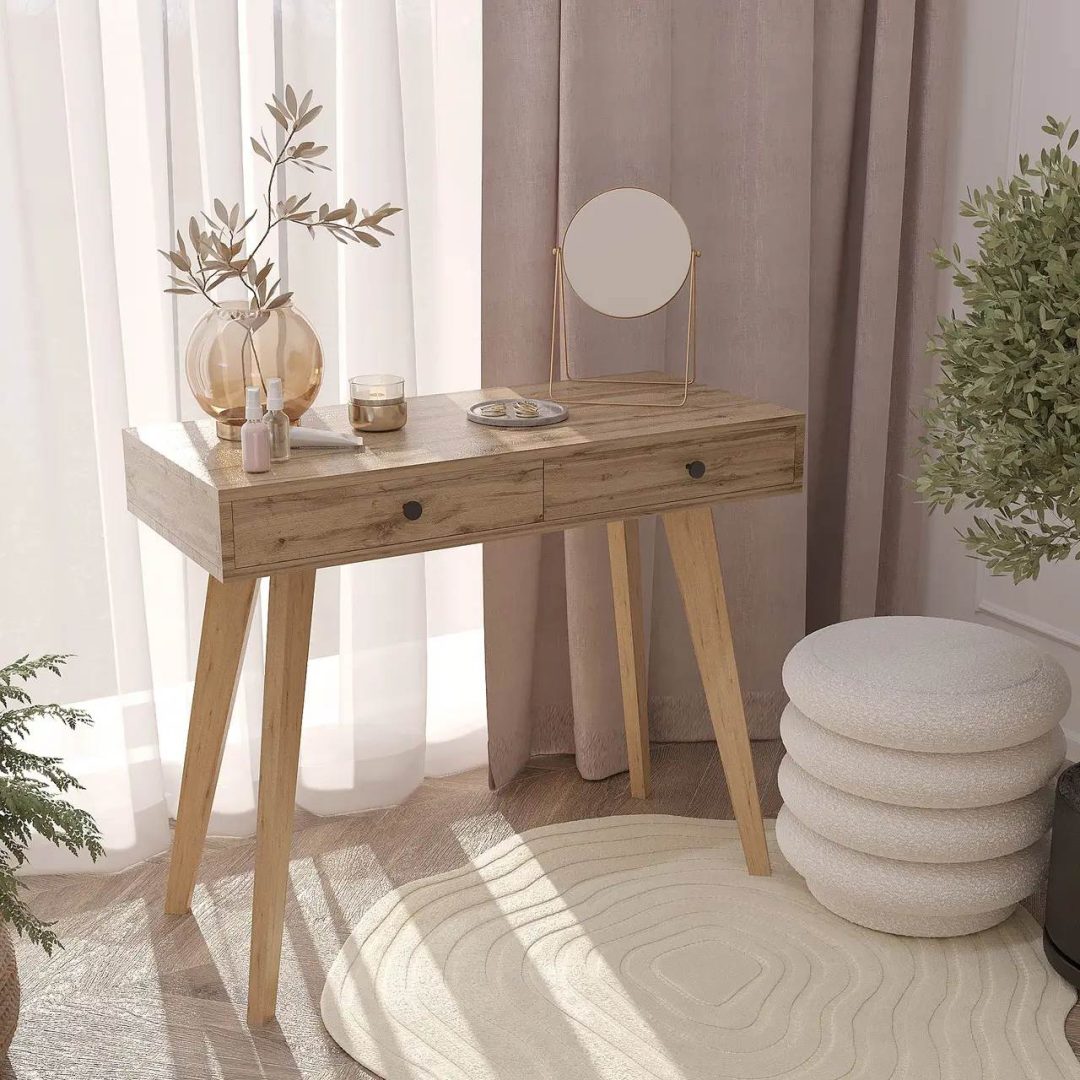 Цей дерев’яний туалетний столик у скандинавському стилі стане стильним доповненням вашого інтер’єру. Оснащений двома висувними шухлядами для зберігання косметики та аксесуарів. Натуральні відтінки та мінімалістичний дизайн створюють атмосферу затишку та гармонії. Ідеально підходить для спальні, гардеробної та вітальні.