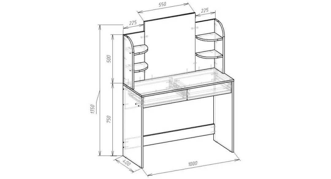 Стильний туалетний столик із дзеркалом і бічними полицями стане ідеальним рішенням для зберігання косметики та аксесуарів. Оснащений двома висувними шухлядами, що допомагають підтримувати порядок. А велике дзеркало допоможе враховувати всі деталі створення образа. Практичний і функціональний вибір для спальні та гардеробної.