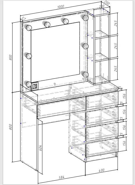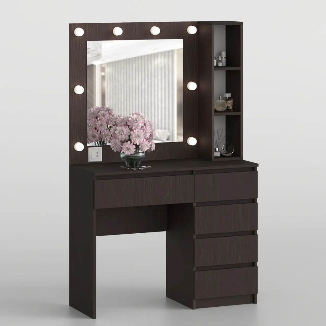 Елегантний туалетний столик із дзеркалом та підсвіткою створює ідеальні умови для макіяжу та догляду за собою. Оснащений зручним висувним ящиком для зберігання косметики та аксесуарів. Додатково до столика можна придбати пуф із м’яким сидінням в одному кольорі. Ідеальний вибір для сучасного інтер’єру спальні або гардеробної.